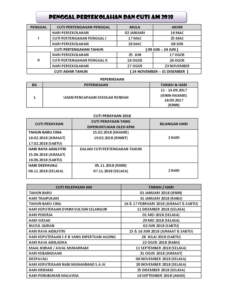 Kalendar Cuti Umum Dan Cuti Sekolah 2018
