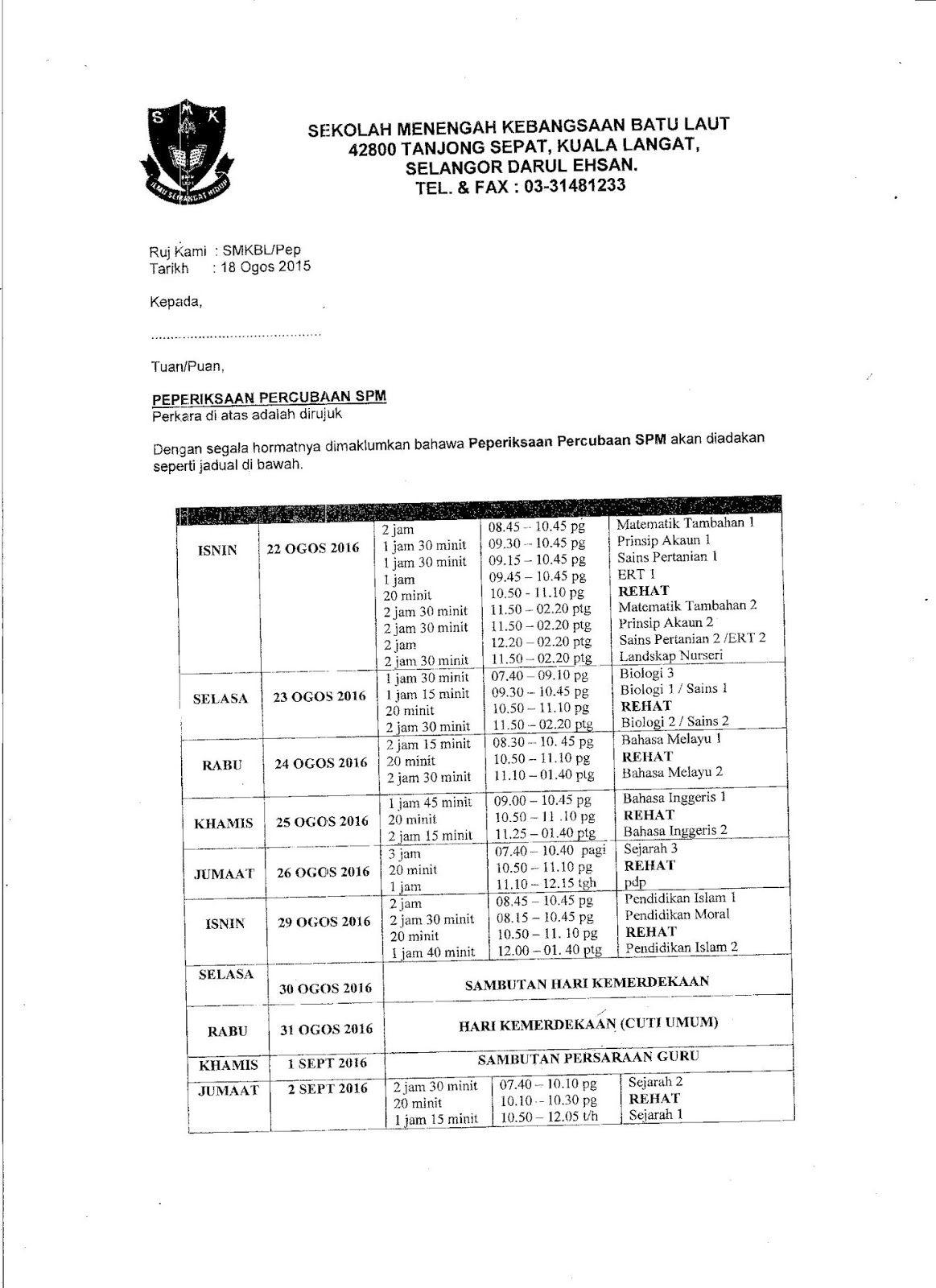 Smk Batu Laut 42800 Tanjong Sepat Kuala Langat Selangor Darul Ehsan Peperiksaan Percubaan Spm 2016