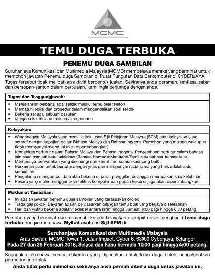 Mcmc Official On Twitter Walk In Interview For Part Time Interviewer 12 13 July 2017 10am 3pm Mcmc Tower 1 Cyberjaya Mcmc Skmm Jobvacancy Jawatankosong Https T Co 4cmz8m71au