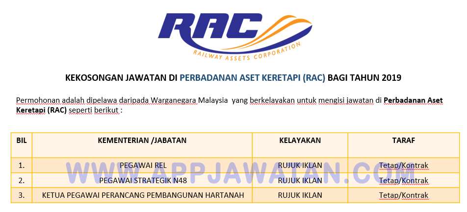 Permohonan Jawatan Kosong Di Perbadanan Aset Keretapi Rac Appjawatan Malaysia