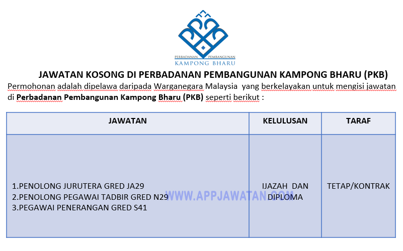 Jawatan Kosong Terkini Di Perbadanan Pembangunan Kampong Bharu Pkb Appjawatan Malaysia