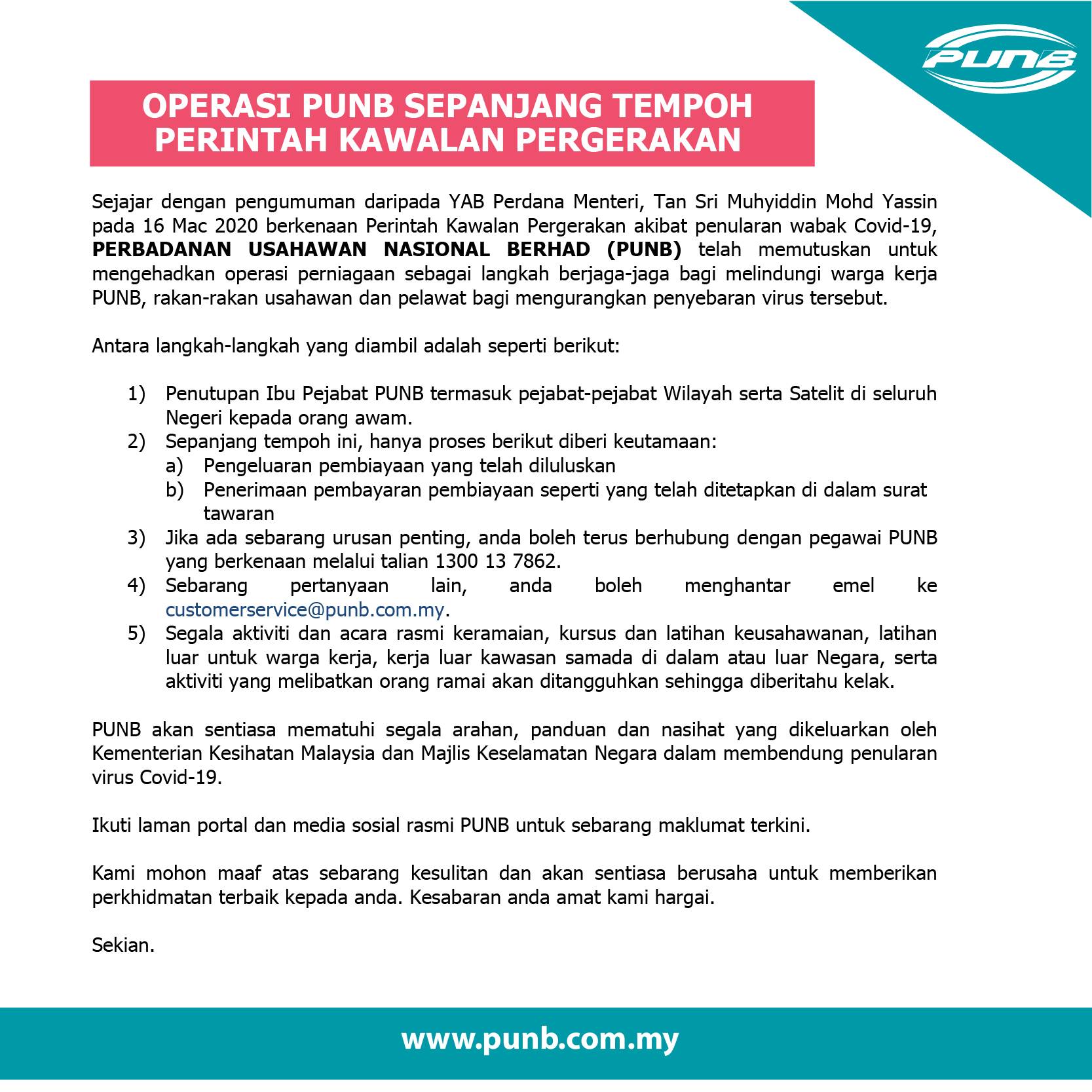 Perbadanan Usahawan Nasional Berhad On Twitter Penutupan Ibu Pejabat Punb Termasuk Pejabat Pejabat Wilayah Serta Satelit Di Seluruh Negeri Kepada Orang Awam Sehingga Ke Tarikh Yang Akan Diberitahu Kelak Untuk Maklumat Lanjut Sila