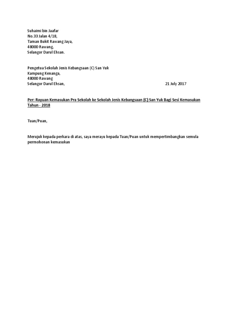 Surat Rayuan Prasekolah Docx Assalamualaikum Dan Salam Sejahtera Tuan Permohonan Rayuan Kemasukan Murid Prasekolah Di Sk Toh Tandewa Sakti Tapah Perak Course Hero