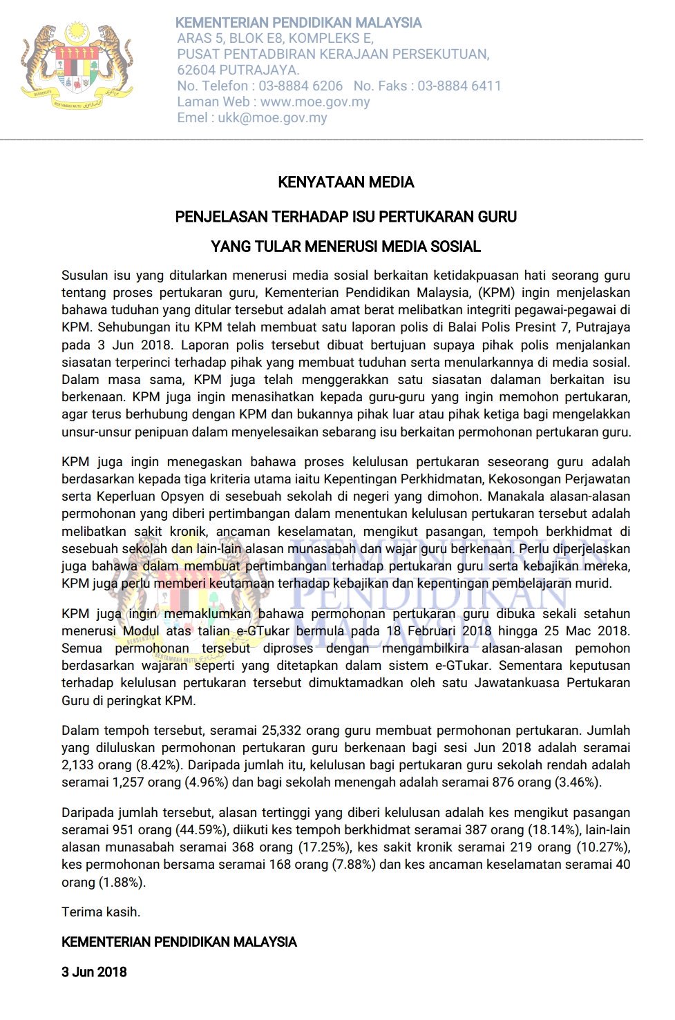 Kpm On Twitter Kenyataan Media Rasmi Kementerian Pendidikan Malaysia Berkaitan Penjelasan Terhadap Isu Pertukaran Guru Yang Tular Menerusi Media Sosial Chedetofficial Drwanazizah Maszlee Https T Co T4l4iflvzh