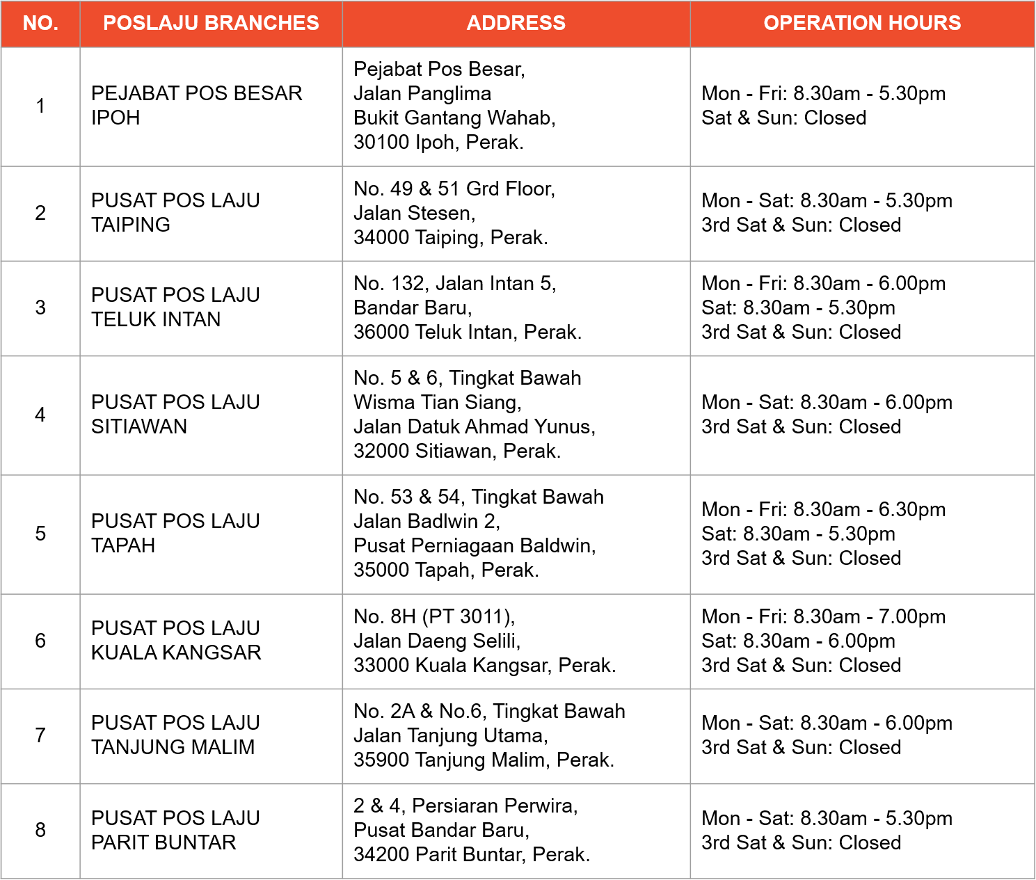 Alamat Nombor Telefon Waktu Operasi Cawangan Poslaju Negeri Perak Pos Malaysia Info Online