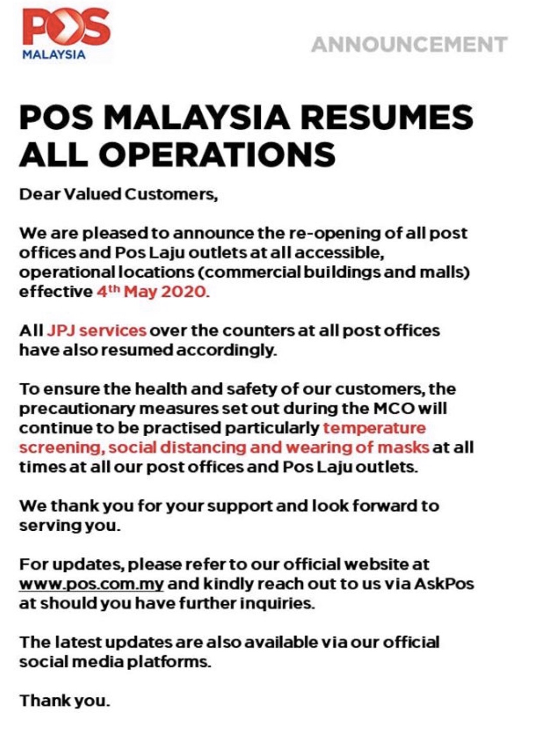 Pos Malaysia Berhad Get The Latest Info On Our Post Office And Pos Laju Outlet That Are Temporarily Closed During The Mco Movement Control Order By Clicking Here Https Newsupdates Pos Com My Posmalaysia Pos4you