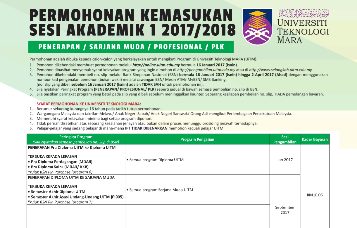 Hea Uitm Johor على تويتر Semua Pelajar Pra Diploma Dan Tahun Akhir Diploma Uitm Sesi Dis 2016 April 2017 Permohonan Penerapan Kemasukan Sesi Akademik 1 2017 2018 Https T Co Hp0i9ggti7