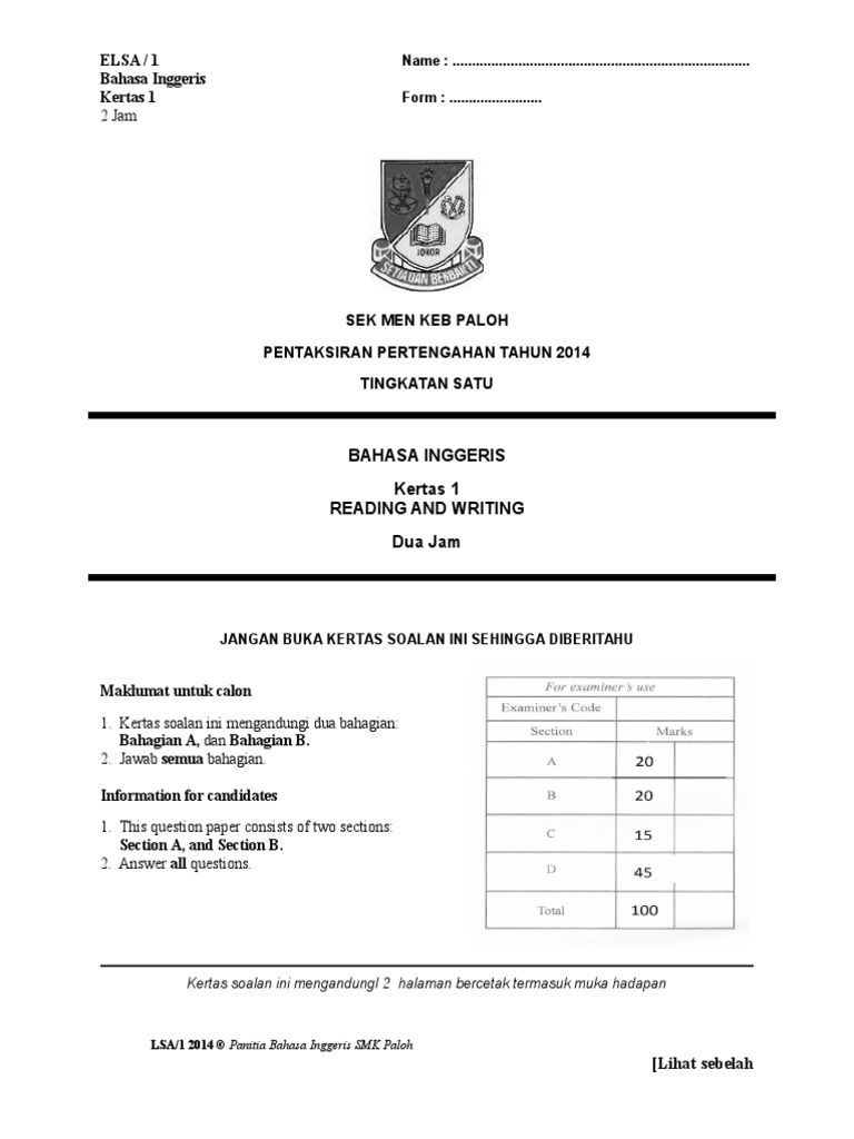 Form 2 English Mid Year 2014 Examination Pt3 Formatted Exam Linguistics Cognitive Science