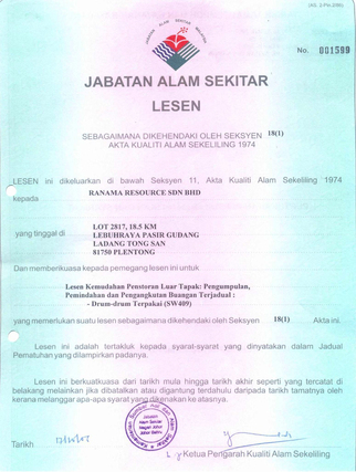Our Licenses Recon Drum Palm Oil Factory Ranama Resource Sdn Bhd