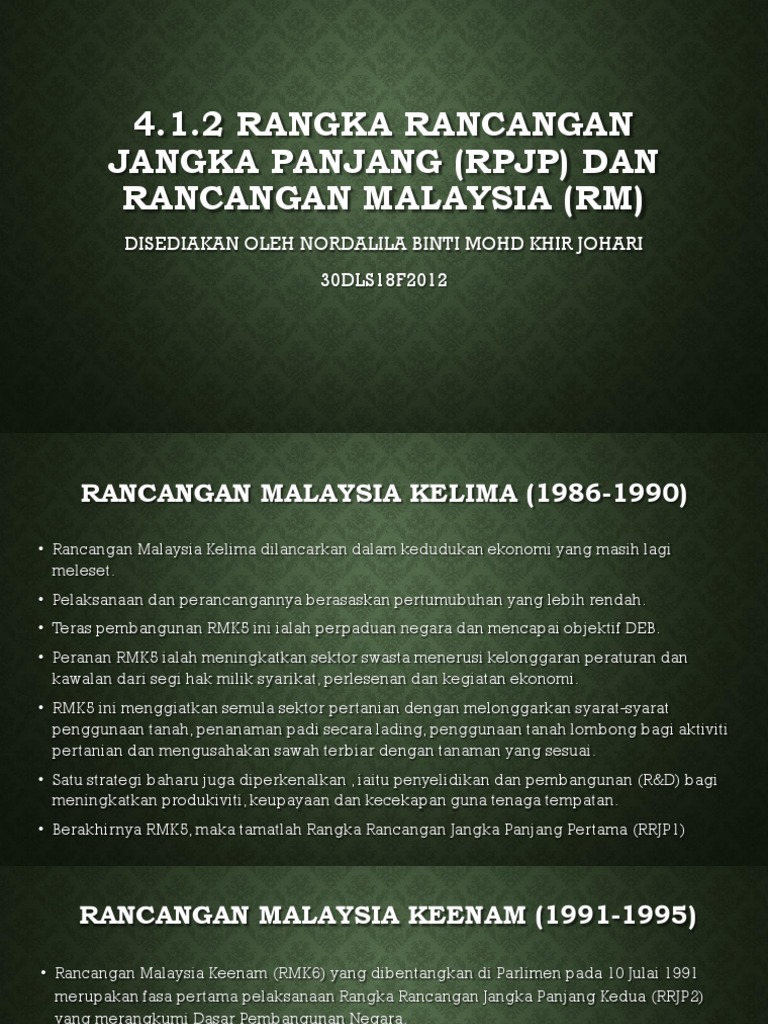 Rangka rancangan jangka panjang kedua. Rangka rancangan jangka panjang pertama rrjp1 meliputi tempoh 1971 90 kini telah tamat di bawah rangka ini kerajaan telah melaksanakan empat rancangan pembangunan bermula dengan rancangan malaysia kedua 1971 75 hingga rancangan malaysia kelima 1986 90 rancangan rancangan pembangunan ini telah dilaksanakan di bawah rangka dasar ekonomi baru deb yang diperkenalkan oleh kerajaan pada tahun 1970 berikutan daripada peristiwa. Pendahuluan 2 01 rangka rancangan jangka panjang kedua rrjp2 1991 2000 telah menjadi asas kepada pelaksanaan dasar pembangunan nasional dpn yang bertujuan untuk mencapai pembangunan seimbang. Unit perancang ekonomi jabatan perdana menteri setia perdana 5 6 kompleks setia perdana pusat pentadbiran kerajaan persekutuan 62502 putrajaya. Rangka rancangan jangka panjang rrjp dan rancangan malaysia rm dasar era dasar ekonomi baru kerajaan telah melancarkan rangka rancangan jangka panjang pertama rrjp1 bermula pada tahun 1971 dan tamat pada tahun 1990 program jangka pendek dijalankan iaitu rancangan malaysia kedua 1971 1975 rancangan malaysia ketiga 1976 1980 rancangan malaysia keempat 1981 1985 dan rancangan malaysia kelima 1986 1990.