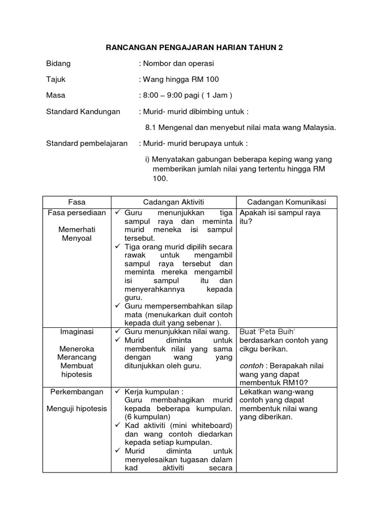 Rph Wang Pdf Rancangan Pengajaran Harian Matematik Mata Pelajaran Matematik Tahun 2 Tekun Bilangan Murid 30 Orang Tarikh Hari 10 Jun 2019 Isnin Masa Course Hero