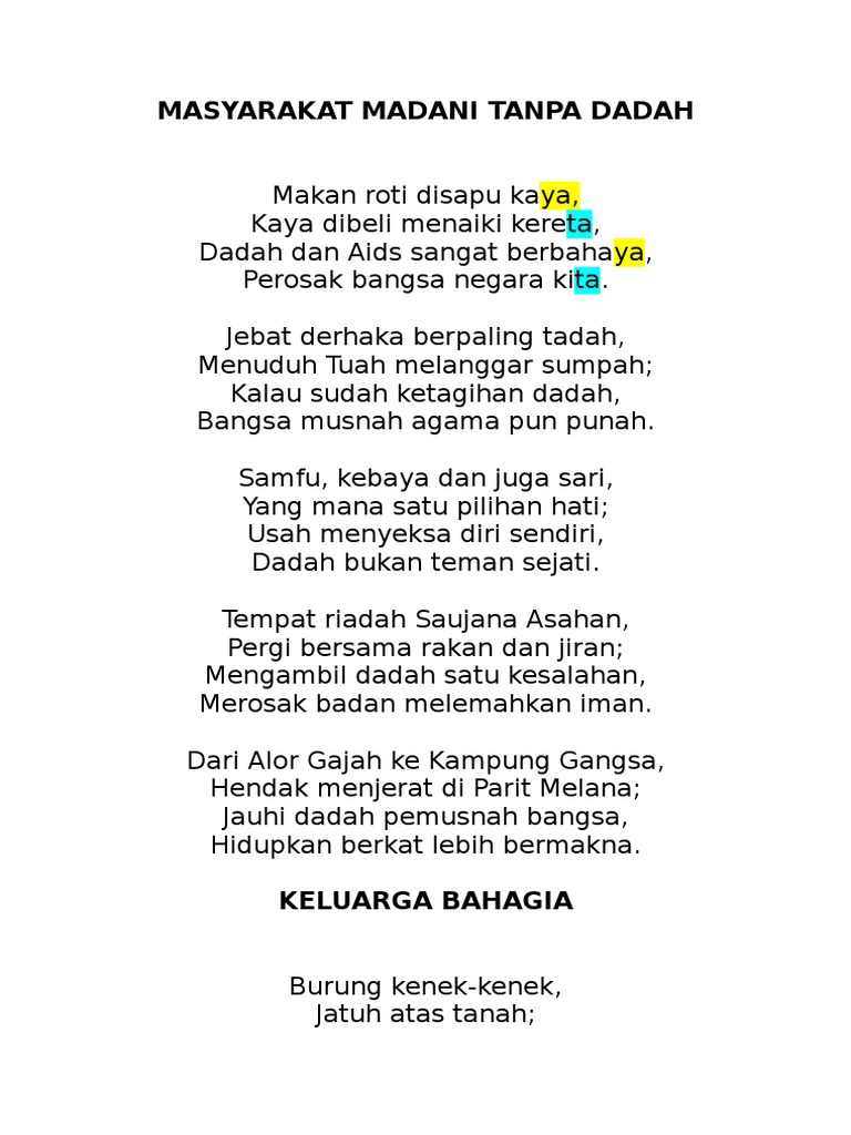 Sajak keluarga bahagia tanpa dadah. Keluarga bahagia ialah sebuah keluarga yang mampu menyelesaikan masalah keluarga dengan berbincang atau menyelesaikannya dengan cara yan. Yehuwa ingin agar kita loyal atau setia. Kasih sayang perhatian dan pengertian akan menciptakan keluarga bahagia. Anakmu ini masih memerlukan petunjuk.