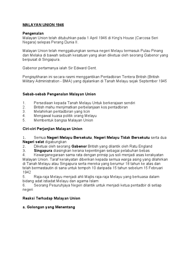 Ciri Ciri Pentadbiran Malayan Union Factor Faktor Kebangitan Masyarakat Tempatan Menentangnya
