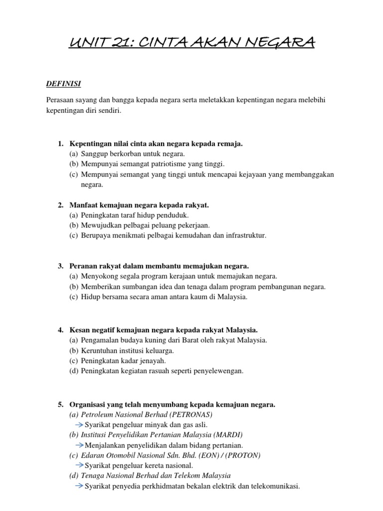 Pelbagai isi dan idea bernas yang boleh diolah oleh pelajar supaya menghasilkan penulisan karangan yang baik. Dengan wujudnya semangat cinta akan negara di kalangan rakyat pasti negara akan terus aman dan damai. Sesungguhnya anasir luar atau musuh negara amat menyukai jika rakyat malaysia tidak mempunyai semangat patriotisme. Selain itu media elektronik itu juga hendaklah menyiarkan filem seperti bukit kepong paloh dan drama drama yang berkaitan dengan semangat cinta akan negara.
